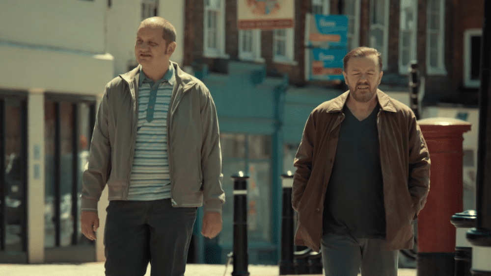 Taki setting jawnie wymusza czarną komedię, bo “After Life” mimo depresyjnego początku wypełnione jest gagami, rzucanymi od niechcenia one-linerami czy wręcz stand-upowymi wstawkami. Komedia Gervaisa zawsze stała na postaciach i nie inaczej jest w tym przypadku. Jako producent, scenarzysta, reżyser i odtwórca głównej roli Ricky bryluje w stworzonym przez siebie małym, angielskim miasteczku pełnym osobliwych, ale zawsze poczciwych osób. Pozycja redaktora gazety pozwala widzowi na obserwację relacji w biurze, ale także poza nim, kiedy Tony z współpracownikami niechętnie wychodzi w teren, aby opisywać kuriozalne historie mieszkańców Tambury – te rozmowy to często komediowy szczyt każdego odcinka, a z biegiem czasu pozwalają Tony’emu dostrzec nieco sensu w egzystencji. Sześć odcinków “After Life” w pewnym ujęciu ukazuje ewolucję bohatera na wzór etapów żałoby. Kontrowersyjne zachowanie Tony’ego zestawi go z konsekwencjami, które rzadko można obserwować w tego typu produkcjach (Co jeśli pogrożę dziecku w podstawówce młotkiem, aby przestał dręczyć dziecko szwagra? Co jeśli sfinansuję heroiniście złoty strzał, zgodnie z jego życzeniem?), a rozmowy z poznanymi, często zbłąkanymi ludźmi pokażą, że świat nie jest czarno-biały.