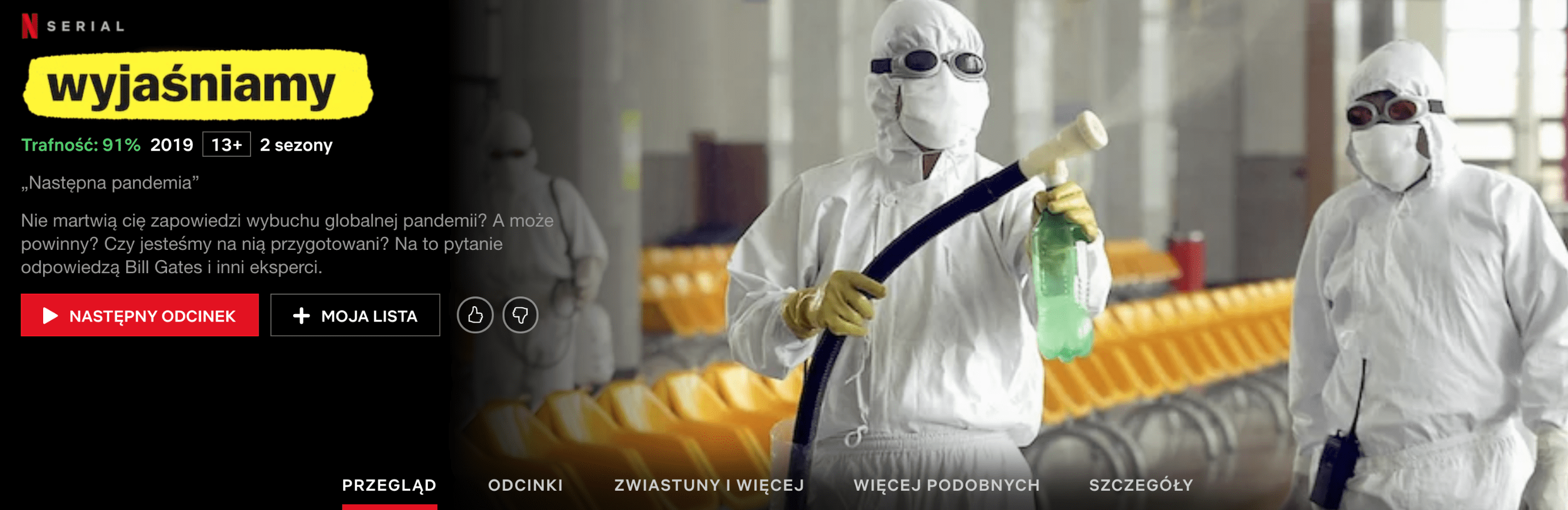 W jednym z odcinków serii dokumentalnej Netflixa Wyjaśniamy opisane jest, w jaki sposób poprzez targi dzikich zwierząt rozprzestrzeniają się epidemie takie jak koronawirus. Bill Gates ostrzega w nim, że znalezienie lekarstwa zajmuje lata.