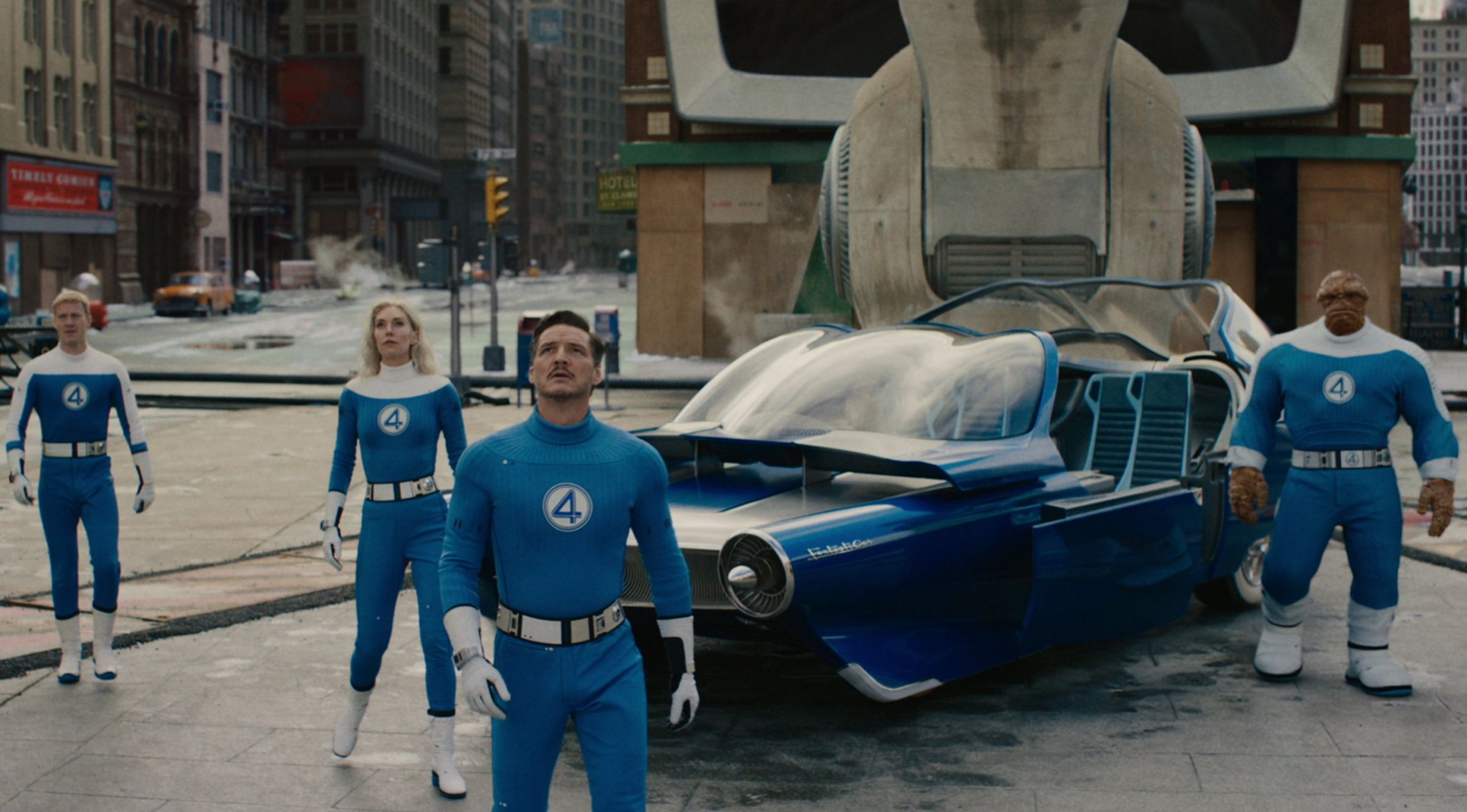 Wydawało się wręcz, że Pierwsza Rodzina Marvela jest z natury zbyt przerysowana i odklejona od rzeczywistości, by z powodzeniem dokonać przeniesienia jej z kart komiksów na ekrany, ale przecież na papierze zaliczyła wiele wyjątkowych, opowiedzianych na poważnie przygód. Chociażby w Fantastyczna Czwórka 1234 Granta Morrisona czy w wizualnym majstersztyku Fantastyczna Czwórka. Pełne koło Alexa Rossa. Tym razem spróbowano jednak czegoś innego. Zamiast desperackich prób wmawiania publiczności, że to wszystko mogłoby wydarzyć się naprawdę, z dumą odwołano się do źródła zainspirowanego kinem ery atomowej, bezwstydnie sięgając po krągłe pojazdy wzorowane na Chevrolecie Corvairze, białe kozaki na wyposażeniu umundurowania i przede wszystkim wierny pierwowzorowi projekt Bena Grimma, zwanego u nas czasami Stworem, kiedy indziej Rzeczą. Przypominający gry z serii Fallout retrofuturyzm nie tylko cieszy oko, pozwala też uciec od wysłużonej estetycznej otoczki filmów Marvela. Paleta kolorów, scenografia i kostiumy, codzienne życie miasta – wszystko tutaj wygląda inaczej.