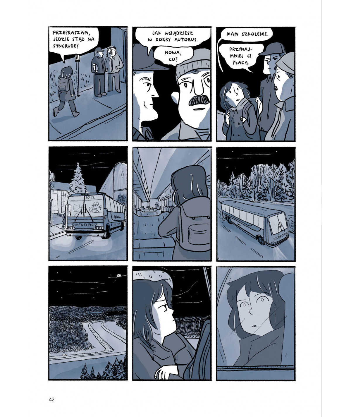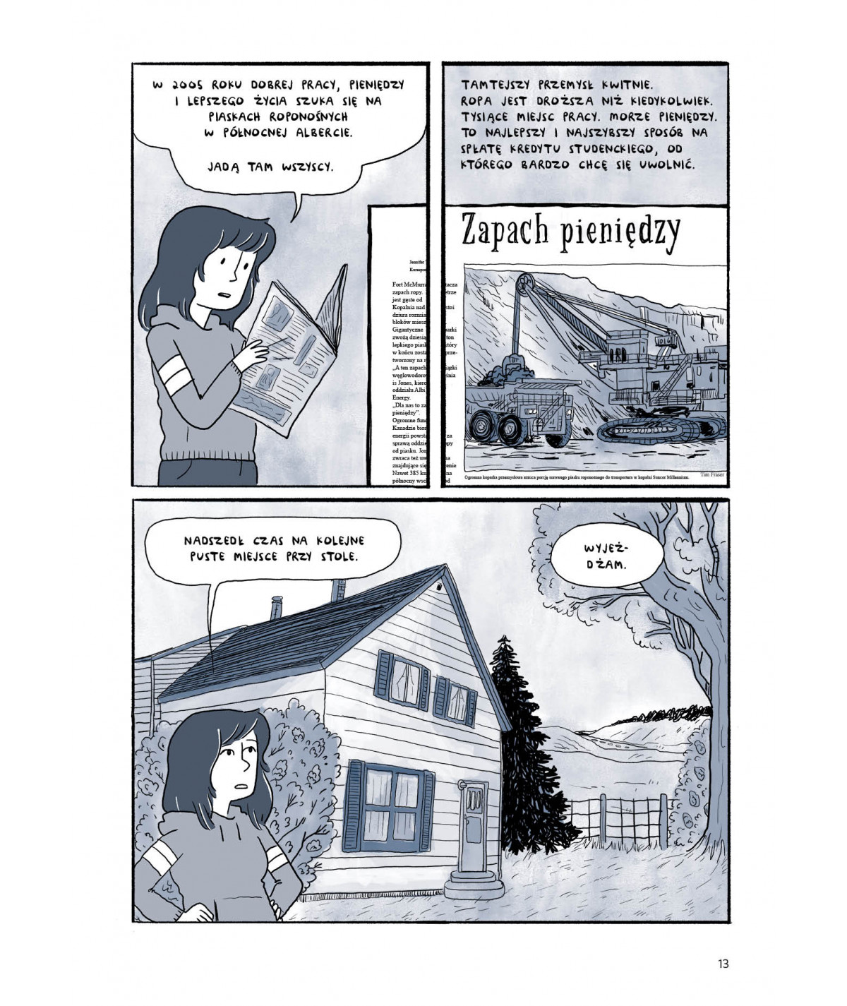Jednocześnie w trakcie lektury bardzo mi przeszkadzała lekka chaotyczność komiksu, wynikająca z braku wyraźnych przejść między poszczególnymi planszami. Czytając Kaczki. Dwa lata na piaskach, odnosiłem wrażenie, że faktycznie przeglądam spisane historie, zwizualizowane strony z pamiętnika. Autorka wielokrotnie bez konkretnych przejść między scenami umiejscawia kolejną planszę komiksu kilka dni czy nawet tygodni później niż poprzednia, często zmieniając także miejsce akcji. Tak, żeby ukazać konkretne interakcje między bohaterami czy dialog, który faktycznie miał miejsce, niekoniecznie skupiając się na tym, co go poprzedzało. Choć momentami wprowadzało mnie to w zakłopotanie (nie zliczę, ile razy w trakcie lektury sprawdzałem, czy przypadkowo nie przeskoczyłem jakiejś strony), w ogólnym rozrachunku historia jest całkiem sprawnie poprowadzona i czyta się ją bardzo immersyjnie, wczuwając się we wszechobecną szarość i obojętny nastrój panujący na polach wydobywczych.