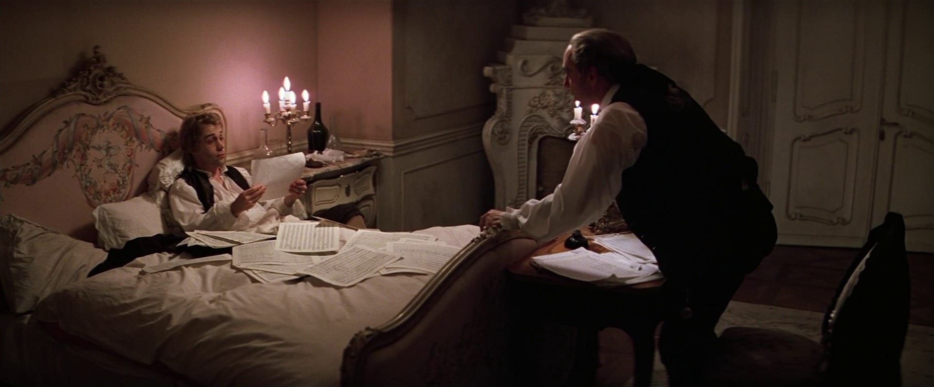 Salieri, grany przez Fahrida Murraya Abrahama, to gustowny włoski muzyk, który, choć pochodził z wiejskiej rodziny, poświęcił całe swoje życie na ciężką pracę, bo głęboko wierzył, że Bóg mu to wynagrodzi. Spotkanie Mozarta to dla Salieriego rzucona przez Boga rękawica, to splunięcie w twarz. Mozart kreowany jest tutaj na wulgarnego figlarza, człowieka niesfornego, niemal niegodnego boskiego talentu, który posiada. Poznajemy go od dupy strony, kiedy wulgarnie zabawia się ze swoją narzeczoną Konstancją, aby po chwili dać nam występ genialny, zupełnie nieprzyrzeczony do charakteru dziecka zaklętego duszy wirtuoza.