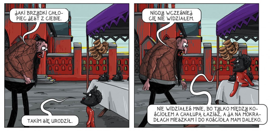 Filmawka daje mi możliwość w “napisach końcowych” każdej recenzji zaproponować kilka tytułów, które przypominają omawiane dzieło lub poruszają podobne co ono tematy. Robię to z miłą chęcią (traktując to jako zabawę w zgadywanie, co może przypaść do gustu potencjalnym odbiorcom danego komiksu czy filmu) i zwykle z łatwością. W przypadku Opowieści Grabarza łamię sobie jednak głowę, bo każdy z tych tekstów, które jako pierwsze przychodzą mi na myśl, wydaje się niewystarczający i słabo trafiony. Jedyne z czym kojarzą mi się prace Wojciechowskiego i co widziałbym jako zasadne w zestawieniu, to wychodzące z użycia, dziś już znane tylko starszym, wychowanym na wsiach pokoleniom, przysłowia. “Będzie z niego ksiądz jak z diabła kościelny”, “połknął czart babę, ale nie mógł jej strawić”, “Bogu świeczka, a diabłu ogarek” – tego typu swojskie, podszyte bogobojnością mądrości najlepiej dla mnie oddają to, o jaką stylistykę zdaje się chodzić autorowi. Niektóre z nich mogłyby zresztą stanowić dość wierne streszczenie wybranych miniaturek z udziałem grabarza.